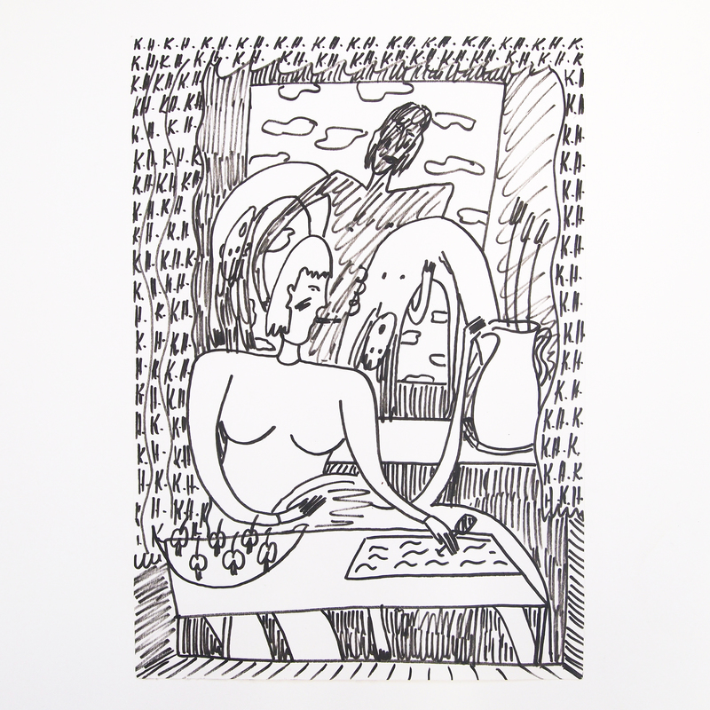 Katharina Höglingers works draw from the experience of everyday life. They are created at the breakfast table, in the studio or while out and about. Whirling thoughts and loose interests are selected and captured instantaneously to be fixed on a medium such as paper, cardboard, fabric or canvas in an interplay of drawing and painting. In keeping with the nested and tangled nature of a thought, Höglinger continues to spin it until overlapping and intertwined figures emerge to inhabit the painterly pictorial spaces. (Text excerpt – Florentine Rungrama Muhry)